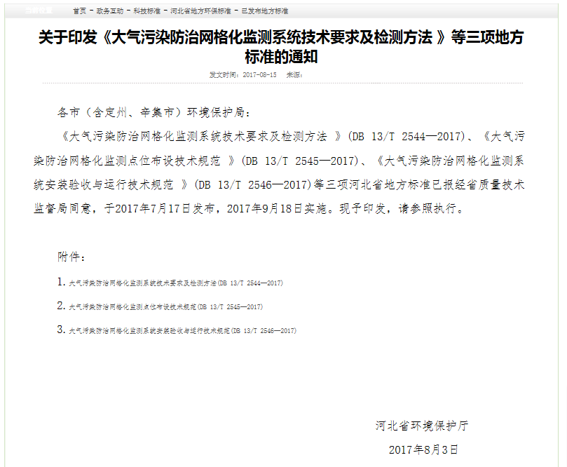 河北省發(fā)布首批網(wǎng)格化監(jiān)測(cè)系統(tǒng)地方標(biāo)準(zhǔn)
