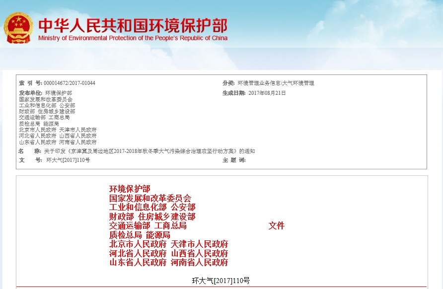 10部委6省市聯(lián)合印發(fā)《京津冀及周邊地區(qū)2017-2018年秋冬季大氣污染綜合治理攻堅行動方案》