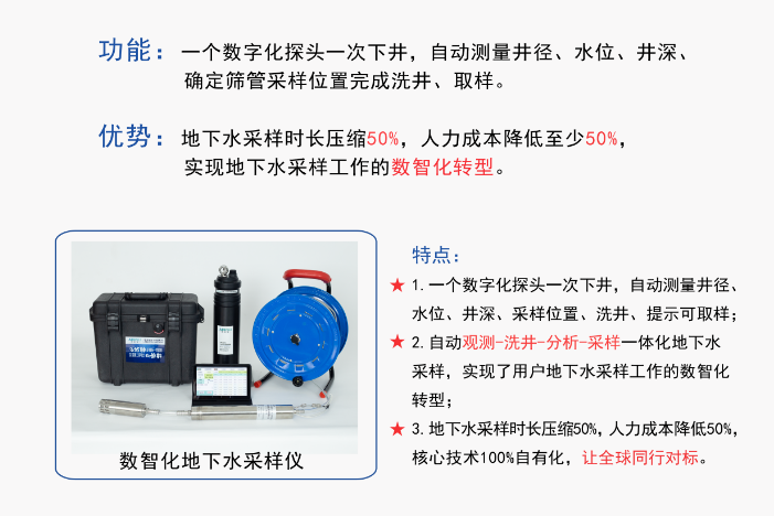 針對(duì)地下水采樣技術(shù)存在的人工測(cè)量各類(lèi)數(shù)據(jù)、洗井采樣位置不清、監(jiān)測(cè)數(shù)據(jù)單分散、采樣誤判率高等問(wèn)題,愛(ài)默里開(kāi)展關(guān)鍵技術(shù)攻關(guān)與裝備集成創(chuàng)新,構(gòu)建全流程數(shù)智化的地下水采樣裝備與技術(shù)體系。通過(guò)一體化數(shù)字探頭集成創(chuàng)新設(shè)計(jì),實(shí)現(xiàn)單次下井同步采集水位、井徑、井深、確定采樣位置并完成洗井采樣等關(guān)鍵參數(shù)。研制了自動(dòng)抽濾、高精度流量計(jì)量及多參數(shù)水質(zhì)檢測(cè)的標(biāo)準(zhǔn)化自動(dòng)控制系統(tǒng)。利用人工智能建立模型算法,科學(xué)判斷采樣位置與采樣時(shí)機(jī)。實(shí)現(xiàn)地下水自動(dòng)觀測(cè)、智能洗井、動(dòng)態(tài)分析、精準(zhǔn)采樣的一體化裝備,在功能創(chuàng)新碾壓進(jìn)口采樣器,幫助用戶(hù)實(shí)現(xiàn)地下水采樣工作的數(shù)智化轉(zhuǎn)型,為地下水現(xiàn)場(chǎng)采樣監(jiān)測(cè)提供了新一代技術(shù)裝備